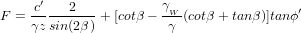 The factor of safety for an infinite slope with cohesion and friction, with ground water at the surface with horizontal seepage is given by,